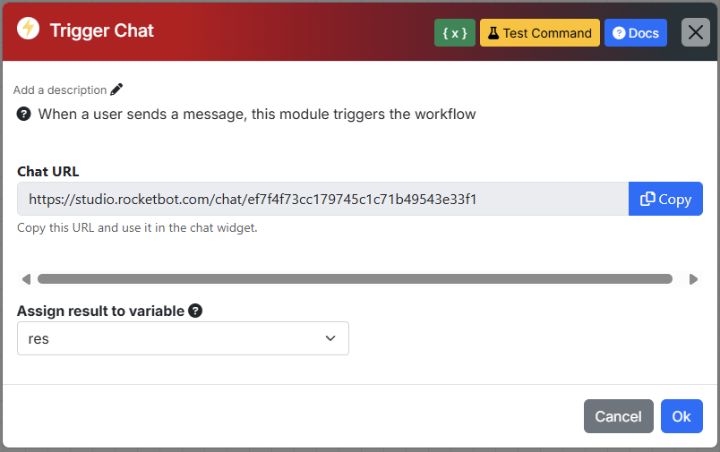 • La URL debe seguir el formato: “https://studio.rocketbot.com/chat/bcc41e580…”