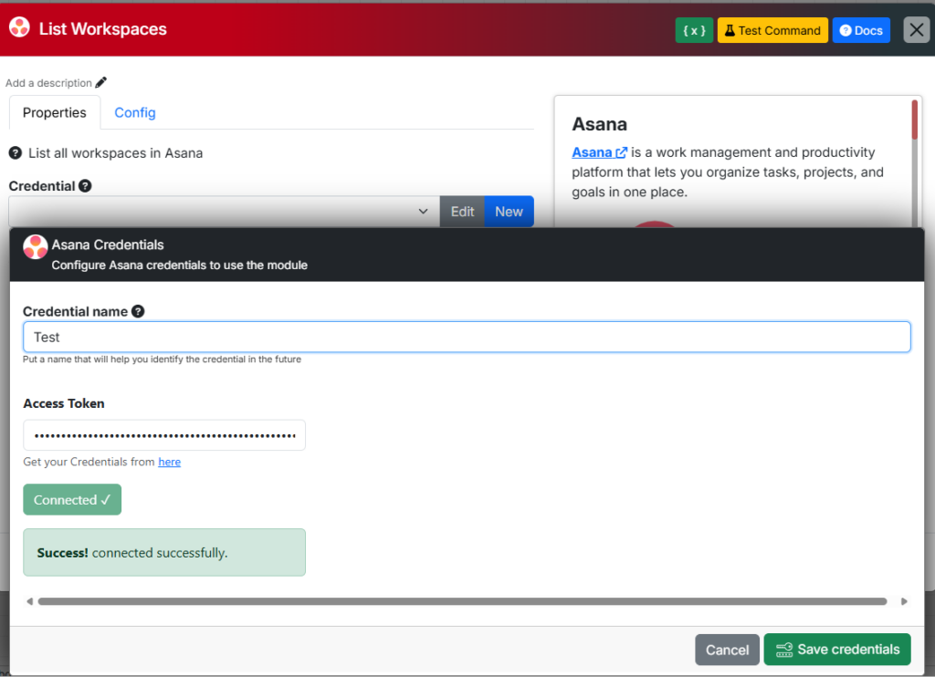 - En el campo Access Token, pega el código alfanumérico que acabas de copiar desde Asana.