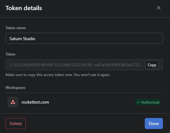 - Token name: Asigna un nombre descriptivo para identificar el token, por ejemplo, “Saturn Studio”.